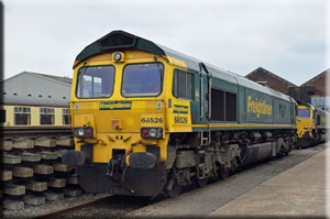 | 66557 is collected by 66526 GLV 68504 waits its turn in the Paintshop |